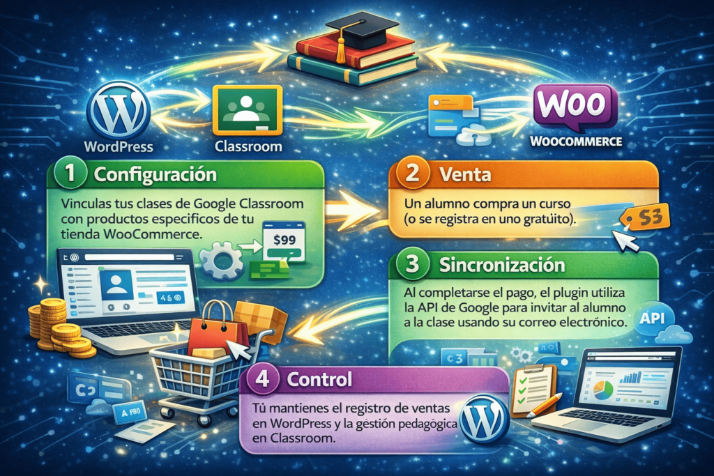 Es un conector inteligente (bridge) que automatiza la gestión de alumnos. Su función principal es simple pero poderosa: cuando alguien compra un curso en tu sitio web, el sistema lo añade automáticamente a su clase correspondiente en Google Classroom. Sin correos manuales, sin demoras.